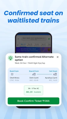 இந்திய ரயில் பயணங்களை திட்டமிடுவது இனி எளிது! ixigo செயலி, பயணிகளுக்கு நம்பகமான மற்றும் வேகமான முன்பதிவு அனுபவத்தை வழங்குகிறது. ஐஆர்சிடிசி அங்கீகரிக்கப்பட்ட இந்த செயலி, 30 லட்சத்திற்கும் அதிகமான பயனர்களிடமிருந்து 4.7 நட்சத்திர மதிப்பீட்டைப் பெற்று, நாட்டின் தலைசிறந்த ரயில் முன்பதிவு ஆப்களில் ஒன்றாக திகழ்கிறது. உங்கள் டிக்கெட் உறுதியாகாமல் போனால், 'மாற்று பயண திட்டம்' மூலம் 3X வரை பணத்தைத் திரும்பப் பெறுவதற்கான வாய்ப்புடன், நம்பிக்கையுடன் பயணிக்கலாம். காத்திருப்புப் பட்டியல் குறித்த கவலைகள் இனி இல்லை, ஏனெனில் ixigo உங்களுக்கு உறுதி செய்யப்பட்ட பயணத்தை உறுதி செய்கிறது.