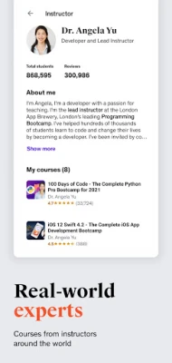 தொழில்நுட்பம் மற்றும் வணிகம் முதல் ஆக்கப்பூர்வமான சிந்தனை மற்றும் தனிப்பட்ட வளர்ச்சி வரை பல்வேறு தலைப்புகளில் நிஜ உலக நிபுணர்களிடமிருந்து கற்றுக்கொள்ளுங்கள். செயற்கை நுண்ணறிவு சார்ந்த பரிந்துரைகள், நெகிழ்வான வடிவங்கள் மற்றும் உங்கள் பணிப்பாய்வில் பொருந்தும் கருவிகள் மூலம், Udemy தொடர்ச்சியான வளர்ச்சியை உங்கள் அன்றாட வாழ்க்கையின் ஒரு பகுதியாக மாற்ற உதவுகிறது.